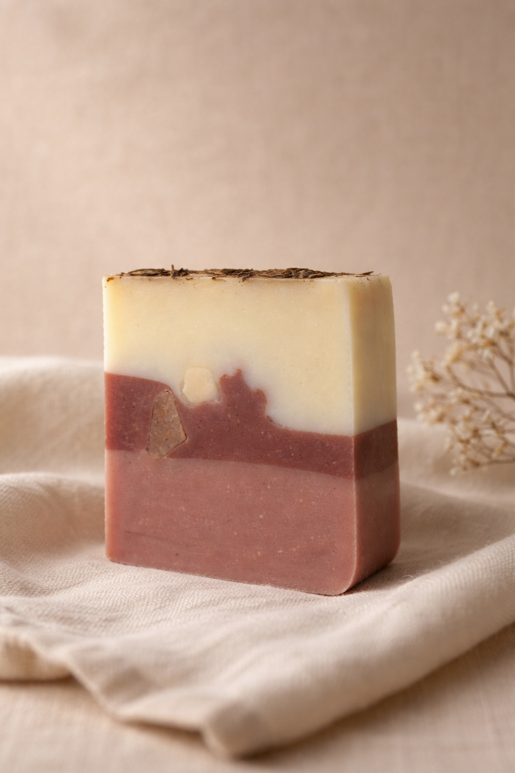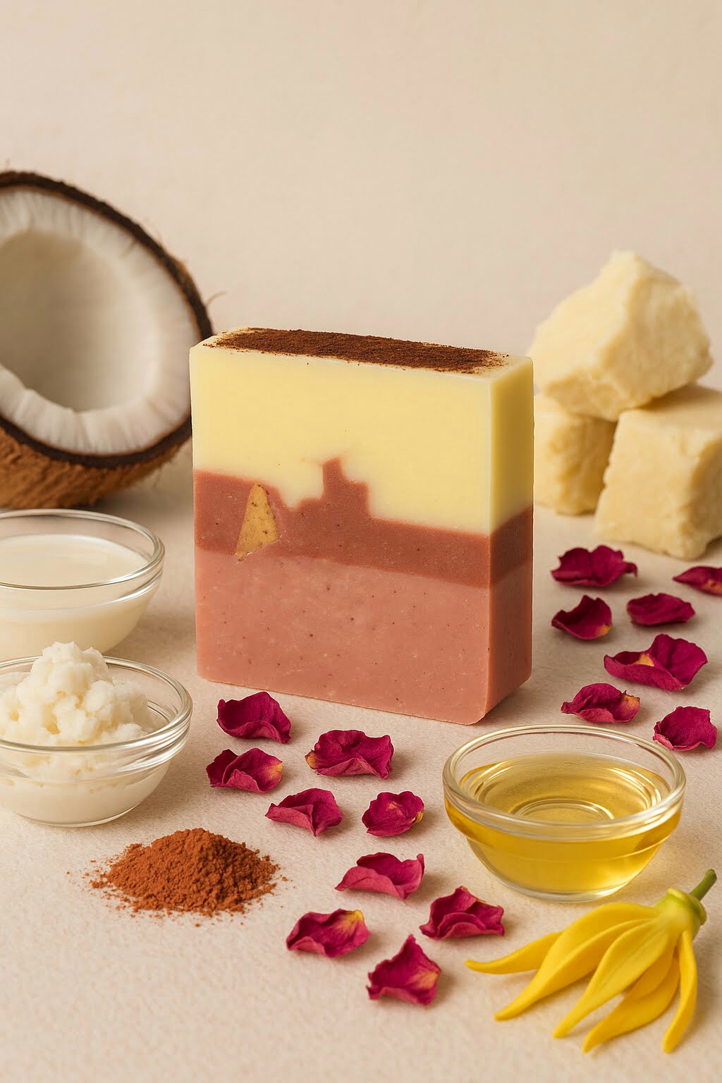 Ingredientes: Óleos saponificados de Azeite (Olea europaea), Óleo de Côco (Cocos nucifera oil), Manteiga de karité (Butyrospernum parkii), Óleo de rícino (Ricinus communis seed); Leite de soja, Argila vermelha, Rosas. Óleos essenciais de Rosas e de Ylang-Ylang (Cananga odorata). 100% vegetal. Peso: 100 gr.