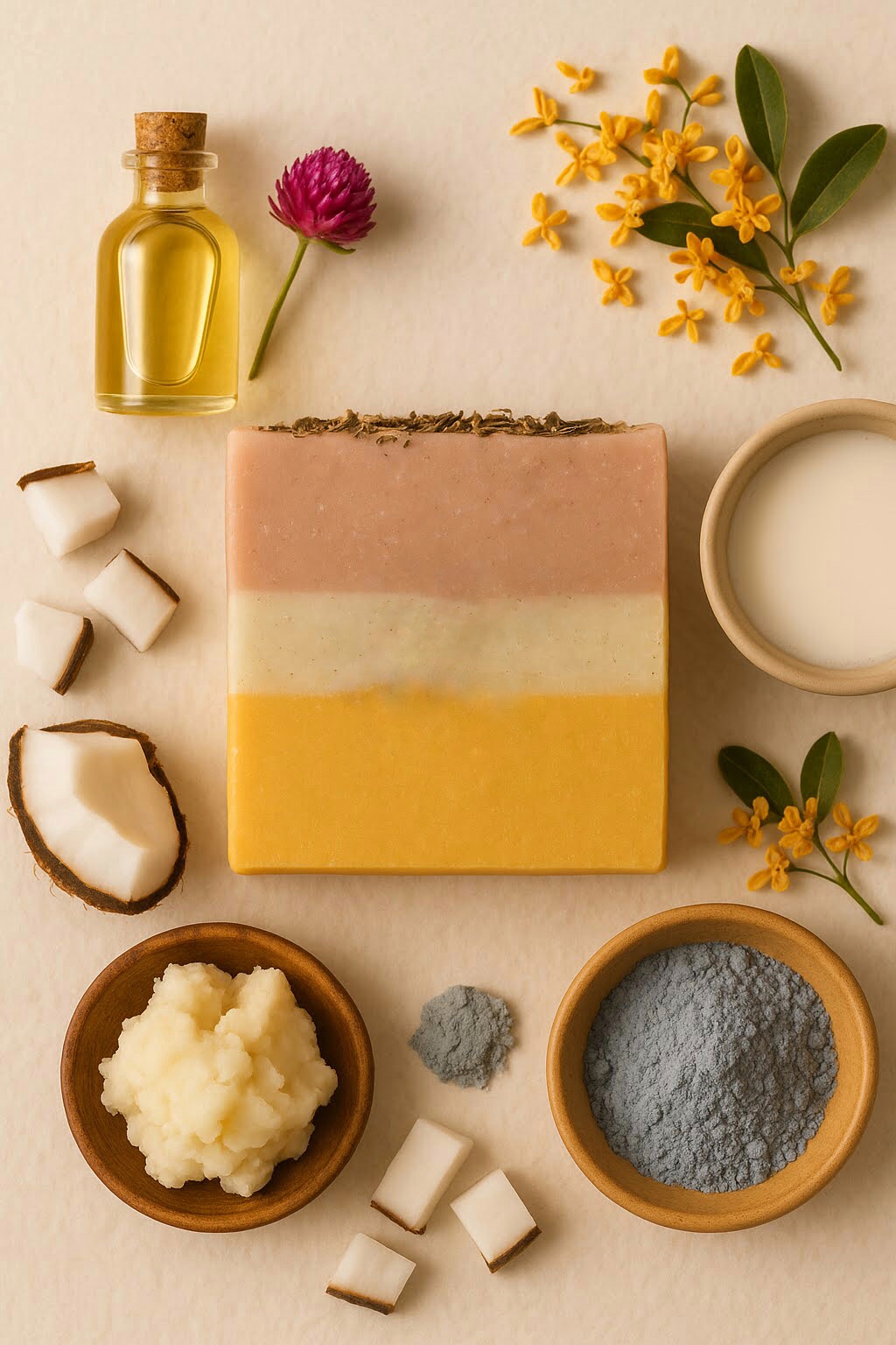 Ingredientes: Óleos saponificados de Azeite (Olea europaea), Óleo de Côco (Cocos nucifera oil), Manteiga de karité (Butyrospernum parkii), Óleo de rícino (Ricinus communis seed); Leite de soja, Argila azul, Perpétua-roxa (Gomphrena globosa), Óleo essencial de Flor de Osmanto. 100% vegetal. Peso: 100 gr.