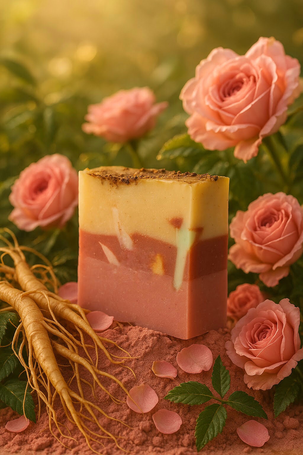 A combinação balsâmica do sabonete natural de Ginseng e Rosas favorece a boa disposição física e mental. O aroma das Rosas emite uma energia relaxante, e o extracto da raíz de Ginseng possui um forte poder afrodisíaco e inspirador.