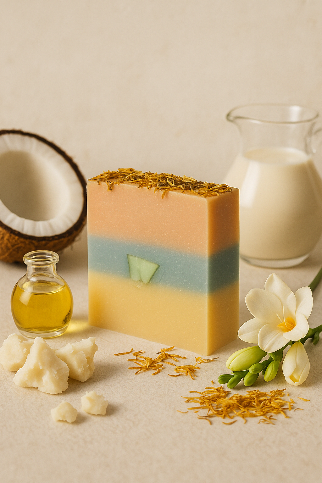 Ingredientes: Óleos saponificados de Azeite (Olea europaea), Óleo de Côco (Cocos nucifera oil), Manteiga de karité (Butyrospernum parkii), Óleo de rícino (Ricinus communis seed); Leite de soja, Calendula officinallis, Óleos essenciais de Lírios e de Fresia. 100% vegetal. Peso: 100 gr.