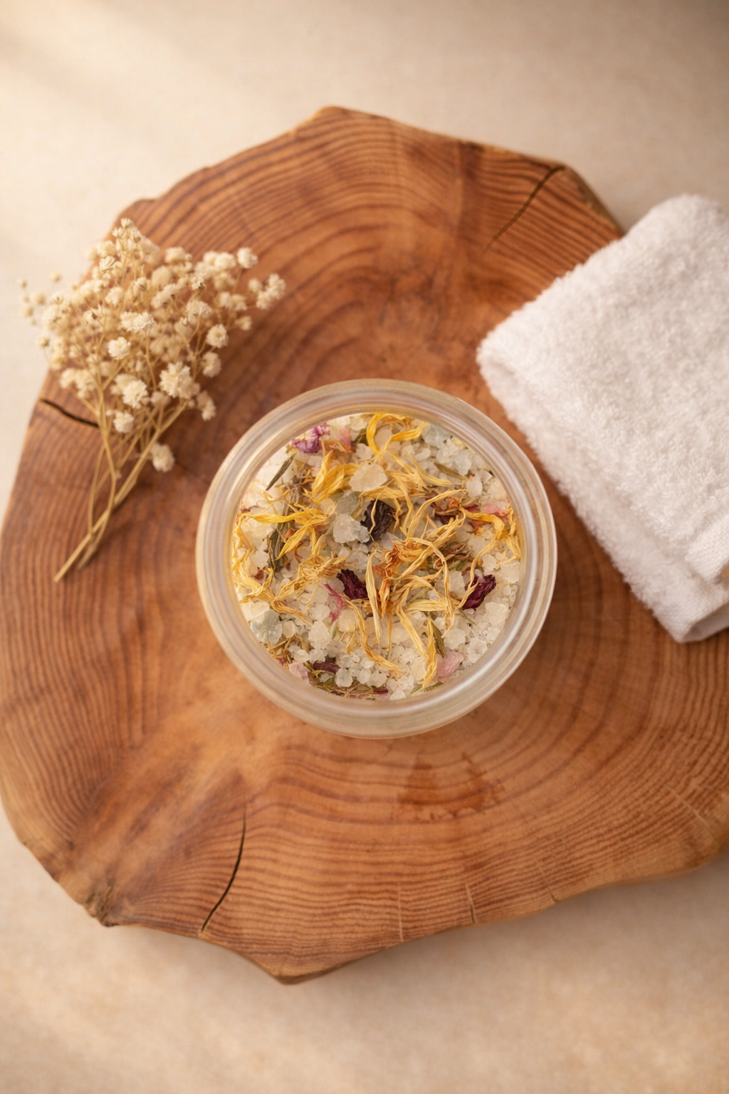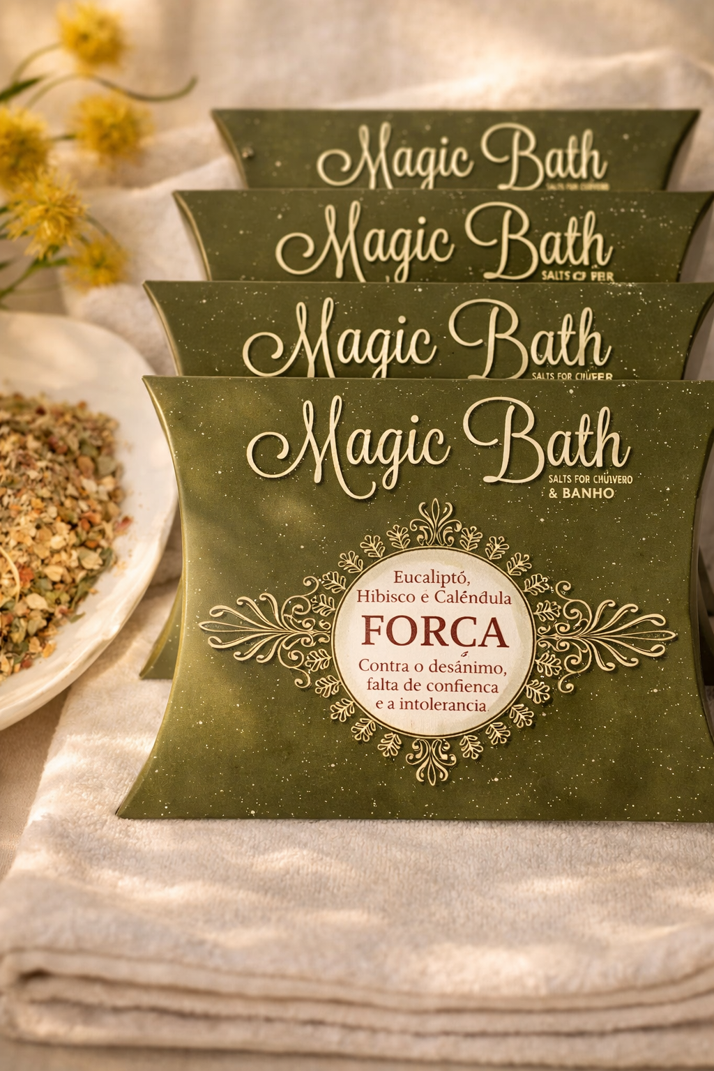NO BANHO: Deite algum conteúdo do sal Magic Bath num banho de imersão (se preferir, utilize o saco de organza, que vem junto). Acenda uma vela. Permita relaxar o seu corpo e a sua mente neste banho.